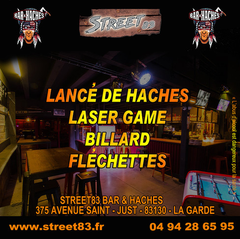 Alors n’hésitez pas une seconde, venez vous détendre avec toute notre équipe et passer un bon moment entre amis ou en famille en jouant au Haches, Fléchettes, Baby-foot, Billard ou air-soft et sur place possibilité de vous restaurer sur place sur fond de musicale !!!